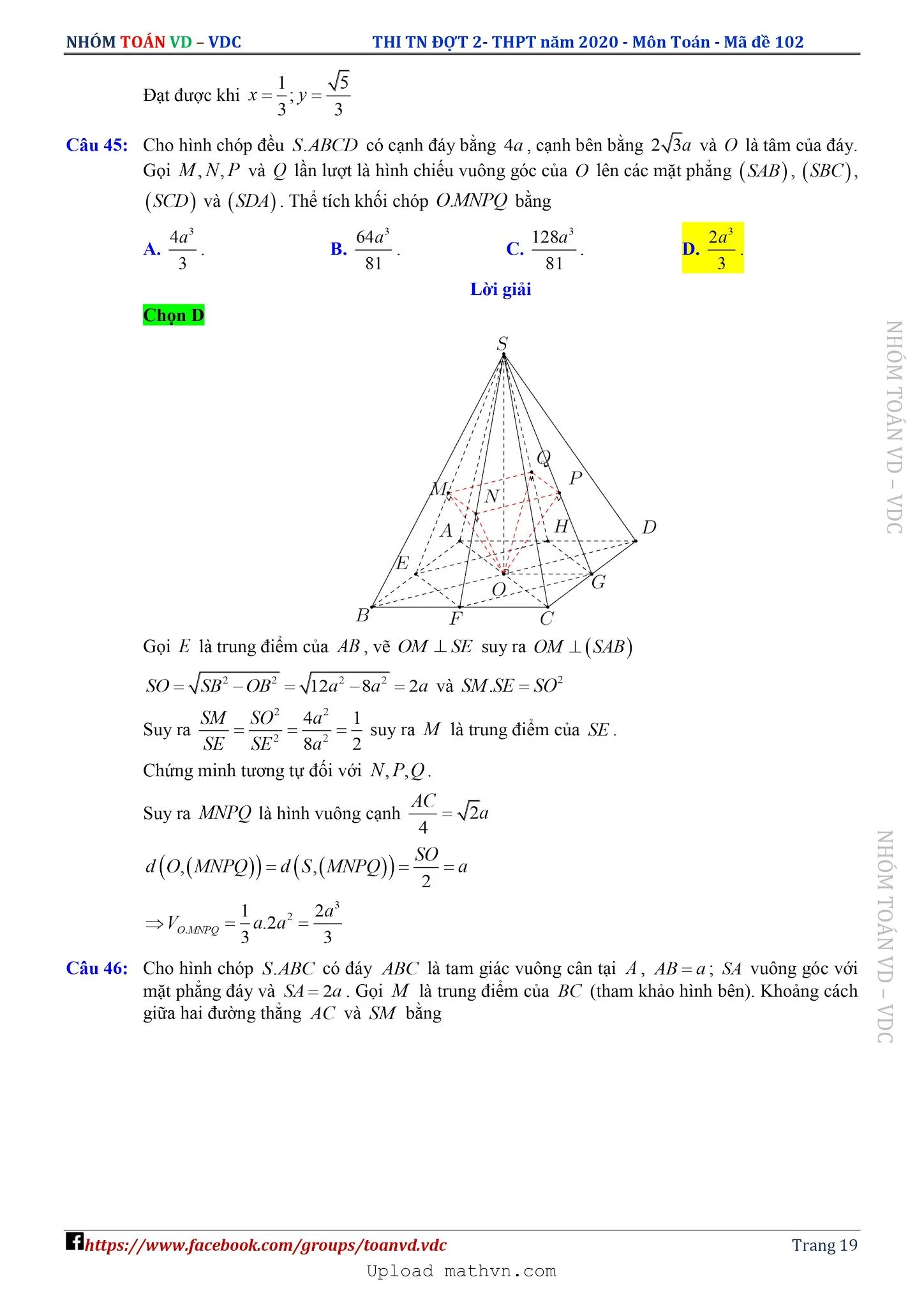 Lời giải chi tiết đề thi tốt nghiệp thpt đợt 2 năm  2020 môn Toán do các thầy cô giáo nhóm Toán VD-VDC biên soạn và chia sẻ trên facebook. Xin giới thiệu cùng bạn đọc.